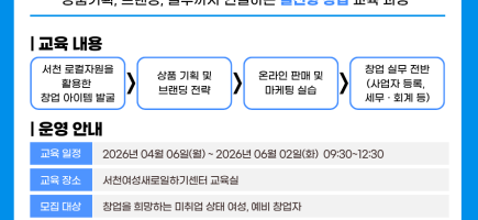 서천여성새로일하기센터에서는 지역 내 여성 예비·기창업자를 대상으로창업 과정 전반에 대한 맞춤형 컨설팅 지원 사업을 운영하고자 다음과 같이 참여자를 모집합니다.■ 사업 개요- 사업명: 2026년 여성 창업지원 패키지 - 창업 컨설팅- 운영기간: 2026년 1월 ~ 12월…