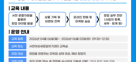 서천여성새로일하기센터에서는 지역 내 여성 예비·기창업자를 대상으로창업 과정 전반에 대한 맞춤형 컨설팅 지원 사업을 운영하고자 다음과 같이 참여자를 모집합니다.■ 사업 개요- 사업명: 2026년 여성 창업지원 패키지 - 창업 컨설팅- 운영기간: 2026년 1월 ~ 12월…